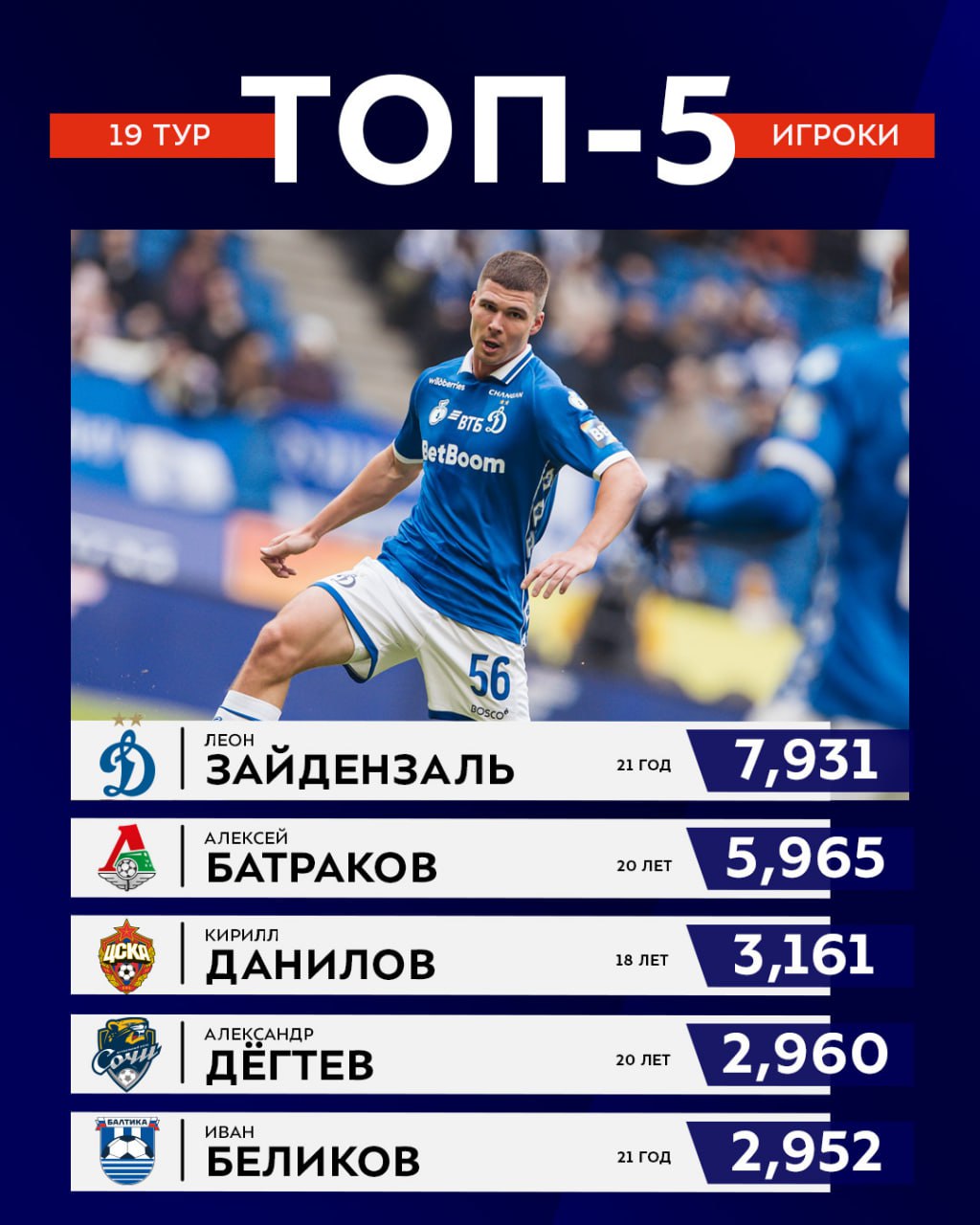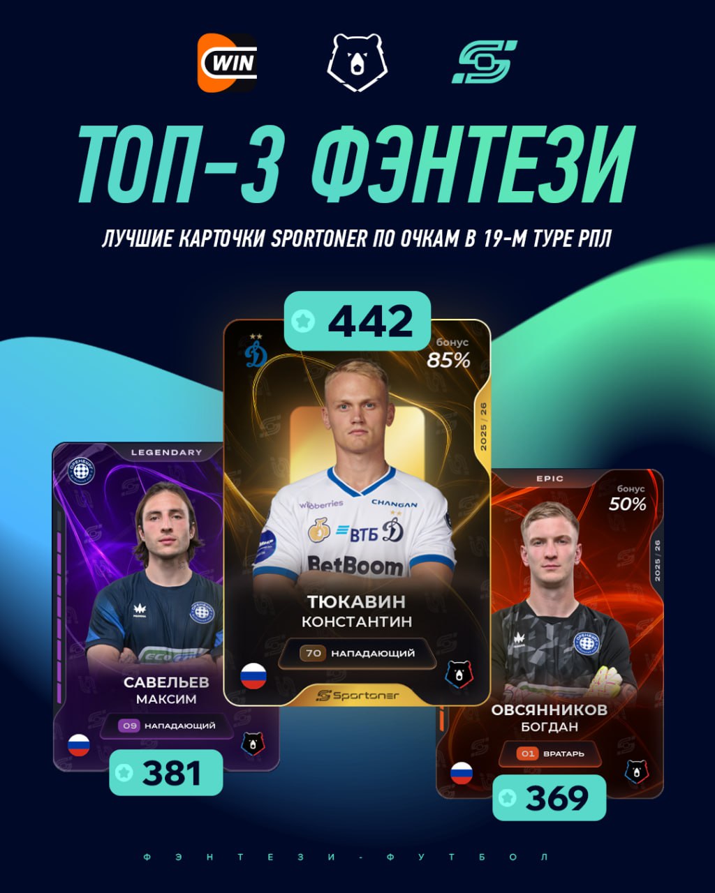 Константин оформил 1+1 в матче с «Крыльями Советов» и помог «Динамо» набрать три очка, а фэнтезистам — 442 балла. Остальные места в топ-3 Sportoner забронировали игроки «Оренбурга» — Максим Савельев и Богдан Овсянников.