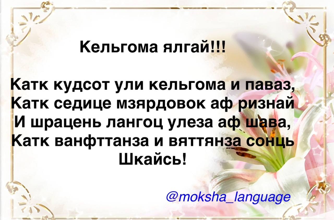 Кельгома ялгат! Кльхченгять (Кльченять) мархта! Катк ару и валда веднясь штасыне минь урманьконь и валдоптсыне ваймоньконь!
