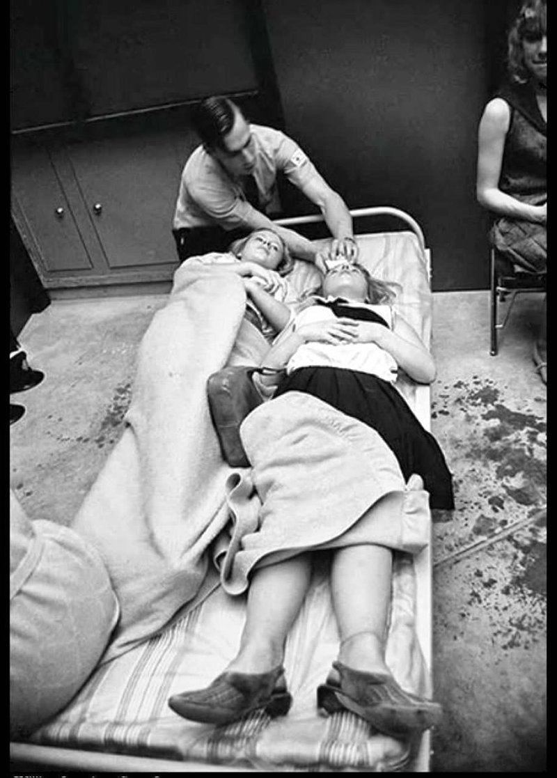 Врач оказывает помощь перевозбудившимся фанаткам во время концерта The Beatles, США, 1964 год.