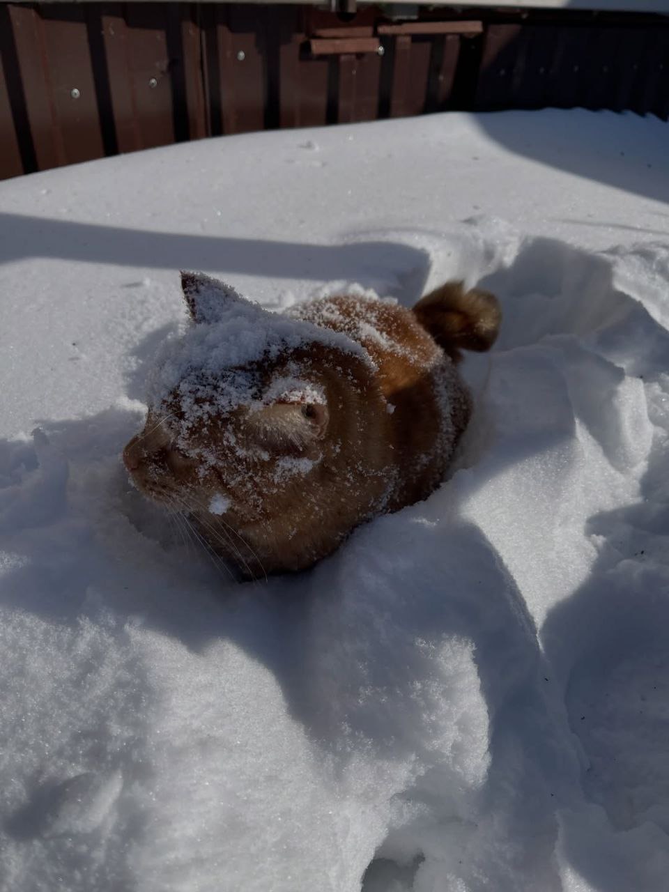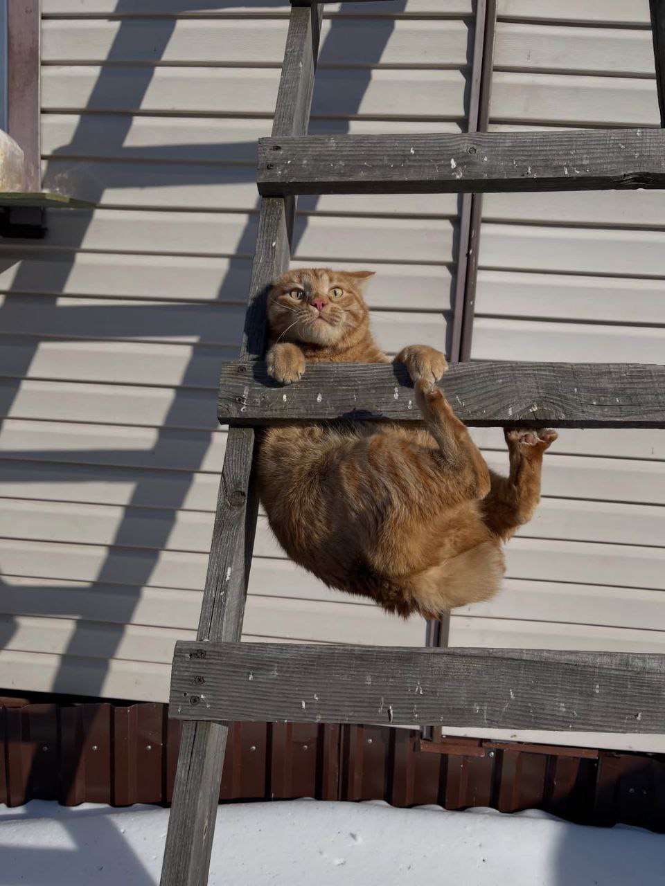 Старался, цеплялся, висел, подтягивался, отдыхал, снова цеплялся, но не получилось, не удержался и упал в снег. Но молодец - не сдавался.