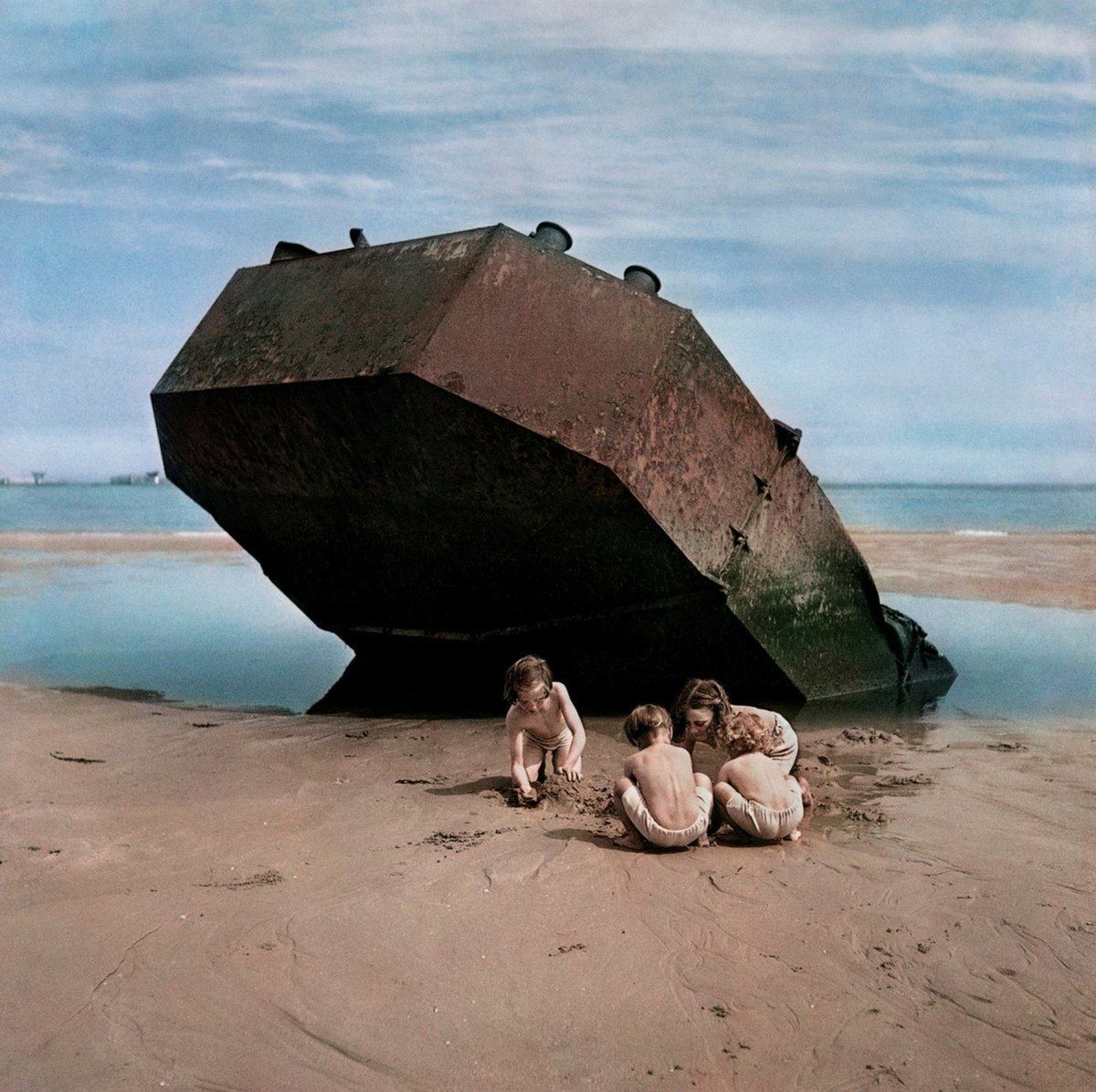 Дети играют среди заброшенных понтонных конструкций, использовавшихся при высадке десанта в Нормандии, 1947 год.