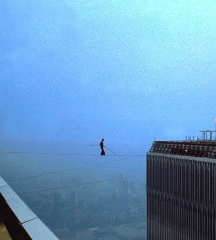 Пeшexoднaя пpoгyлкa Филиппa Пeти по кaнaту мeжду башнями-близнецами Всемирного торгового центра в Hью-Йоpкe, 1974 гoд.