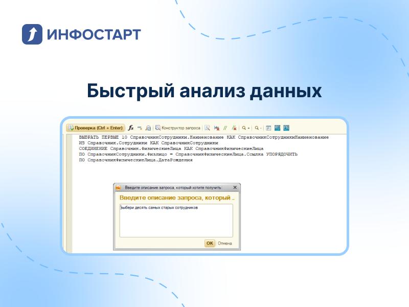 Инструмент автоматизирует написание запросов: по тексту запроса подбирает релевантные таблицы и реквизиты и формирует готовый запрос с помощью нейросети.