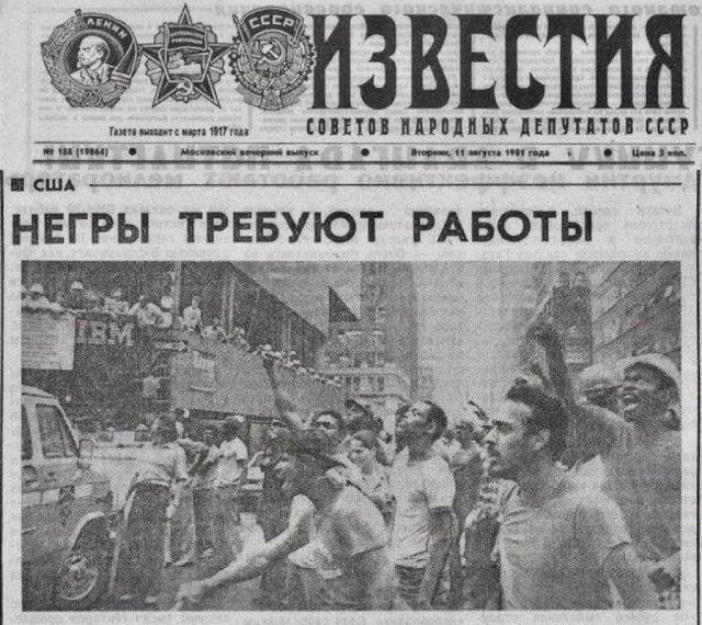 Советская газета «Известия» с не очень политкорректным заголовком о мирных протестах чернокожих афроамериканцев в США, начало 80-х.