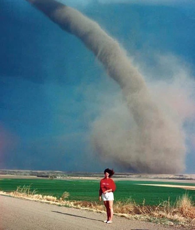 Девушка из Небраски - Одра Томас, фотографируется на фоне торнадо, Лето 1989 г.