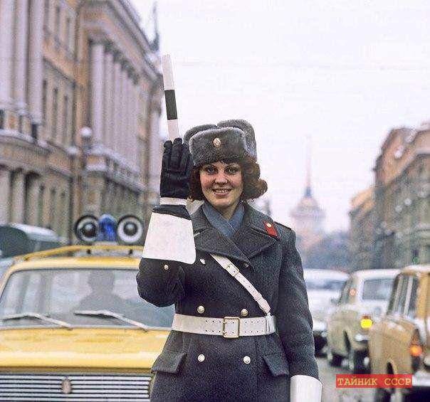 Девушка-инспектор ДПС на Невском проспекте в Ленинграде 1976 год