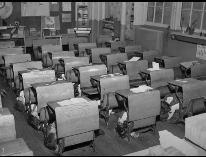 Американские школьники 1950-х годов отрабатывают меры безопасности на случай ядерной атаки.