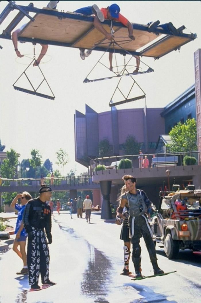 На съёмках «Назад в будущее 2» во время постановки сцены с летающими скейтбордами, 1989 год.
