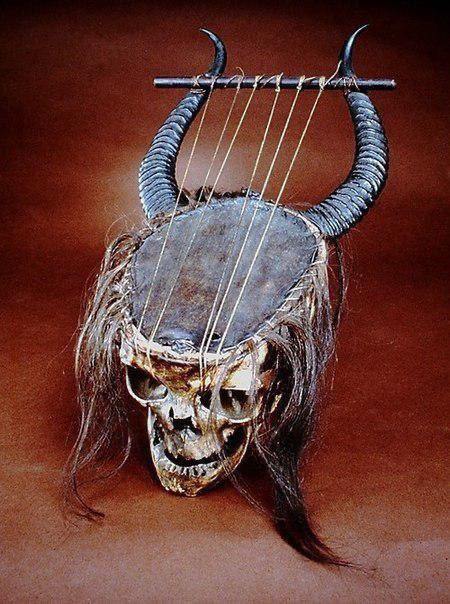 Лира XIX века: человеческий череп, волосы, рога антилопы и струны из кожи. Экспонат Метрополитен-музея, Нью-Йорк.