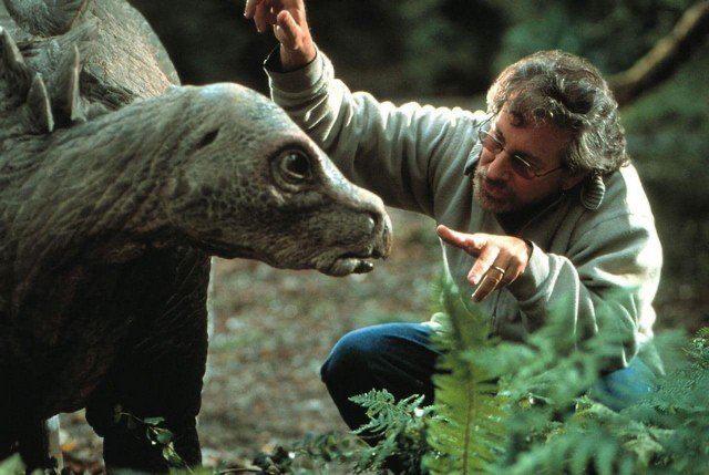 Съемки фильма "Парк Юрского периода 2: Затерянный мир", режиссер картины Стивен Спилберг инструктирует Стегозавра перед дублем, Австралия, 1997 год.