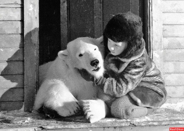 Медвежонок Айка и девочка Вероника Ледина. Земля Франца-Иосифа, остров Хейса, 1974 год.