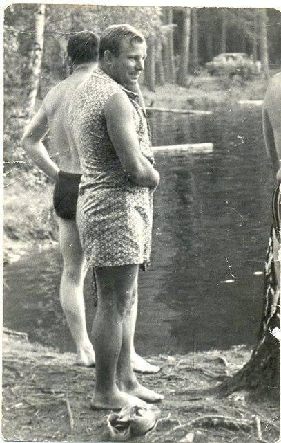 Юрий Гагарин в модном платье на пикнике космонавтов, 1960-е годы.