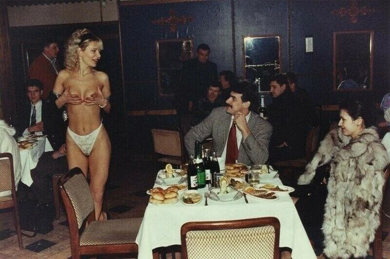 На фотографии изображен коммерсант и валютные путаны в элитном заведении Санкт-Петербурга, 1993 год.