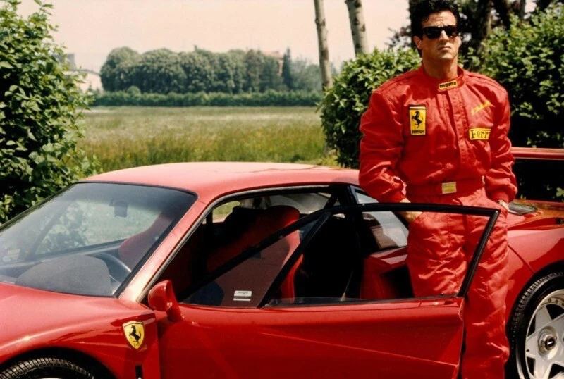 Сильвестр Сталлоне позирует рядом с Ferrari F40 на трассе во Фьорано, 1990 год.