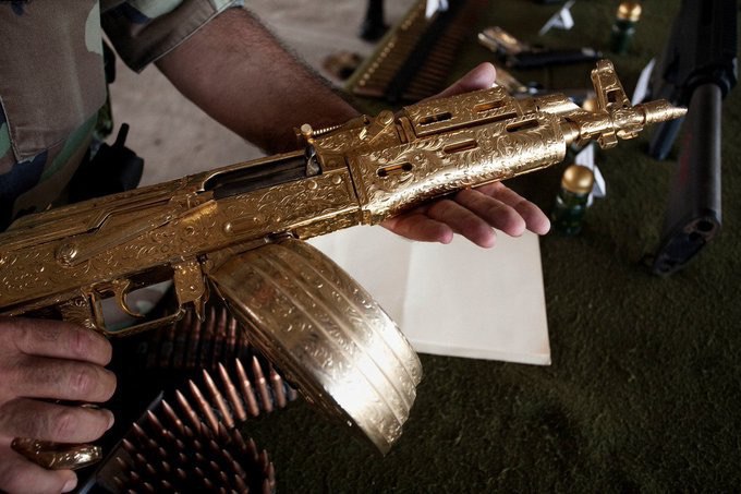 Мексиканский солдат демонстрирует позолоченный автомат АК, изъятый у наркоторговцев из штата Синалоа, 2008 год.