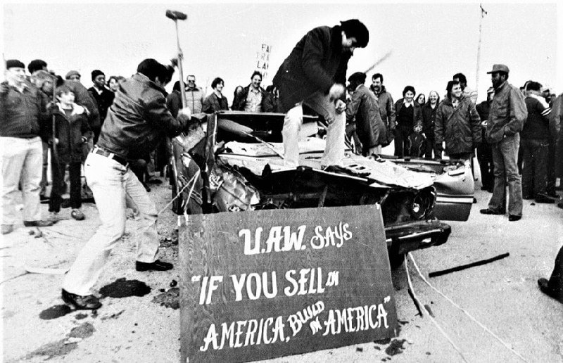 Американские автозаводские рабочие разбивают кувалдой автомобиль Toyota. 1983 г.