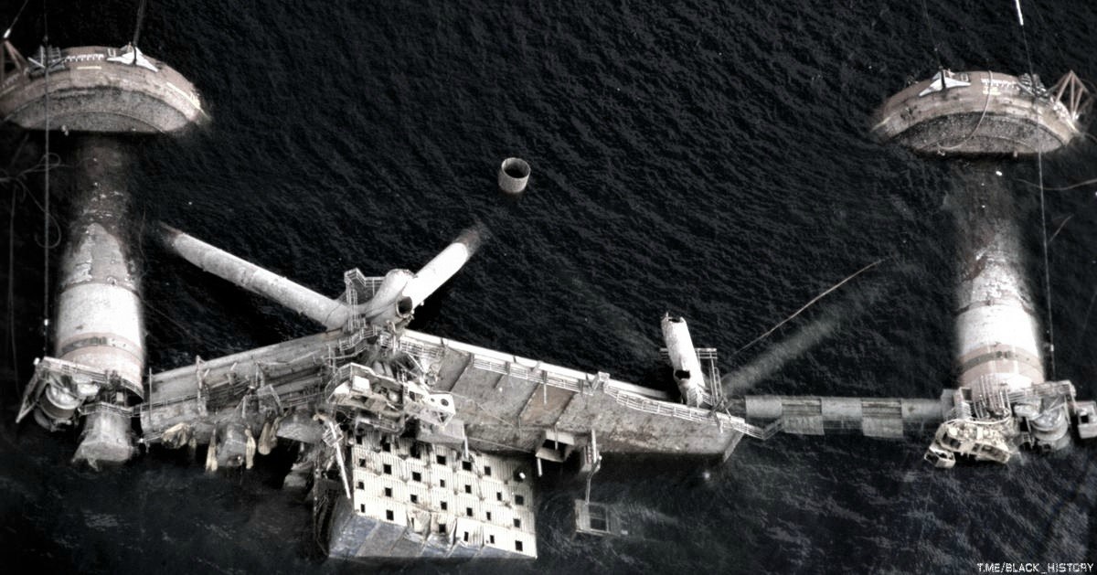 Подъем нефтяной платформы Alexander Kielland. Одна из опор этой платформы надломилась затем платформа перевернулась на бок, более 100 человек погибло. 1980е годы, Северное море, Норвегия.
