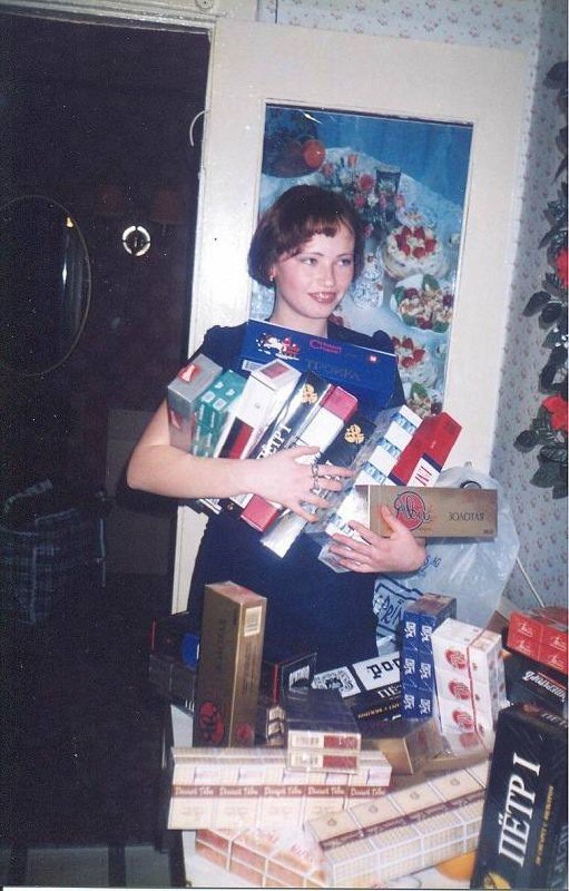 Владелица табачной палатки проводит инвентаризацию у себя дома, 1998 год.