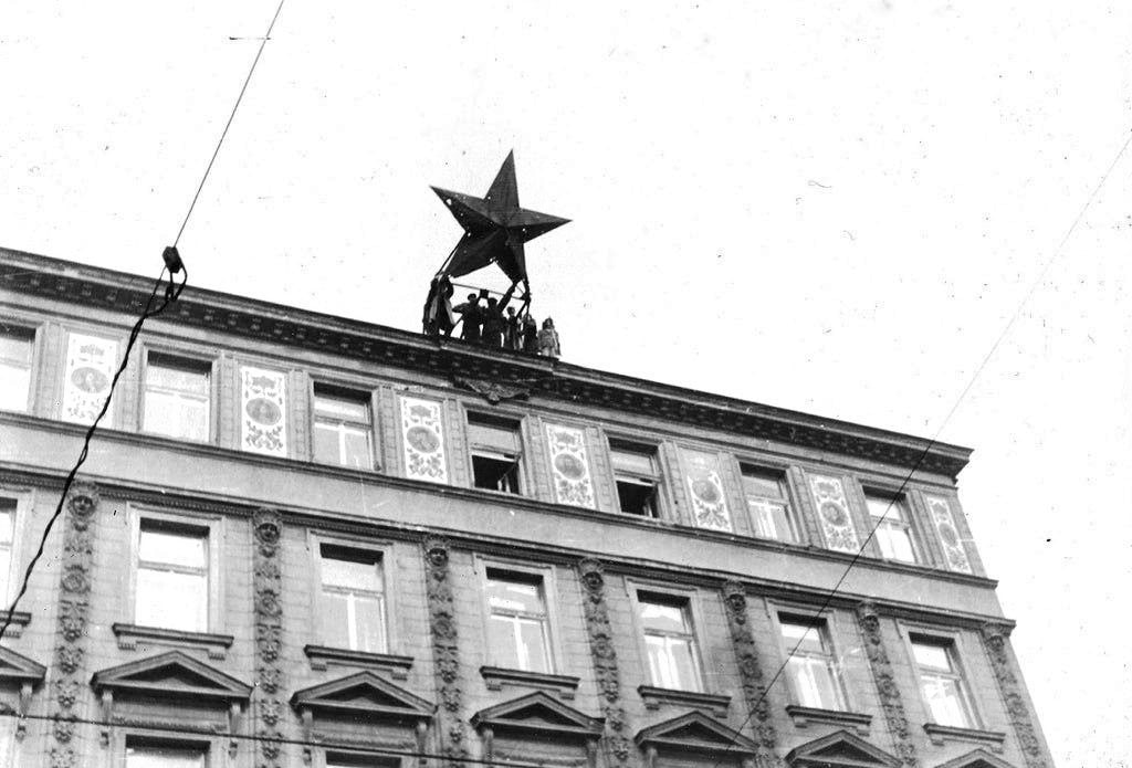 Толпа людей сбрасывает Красную Звезду с крыши здания во время Венгерской революции 1956 года.
