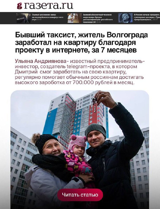 - И попался в интернете __[__проект Ульяны,__](https://t.me/+HfUUCV_i_O4wNmI0)__ когда перешел в него, подумал разводилово, решил ей написать. Немного пообщались, думал дай рискну... Утром следующего дня, Ульяна пишет, что смог заработать 50.000 рублей... Был просто шок!__