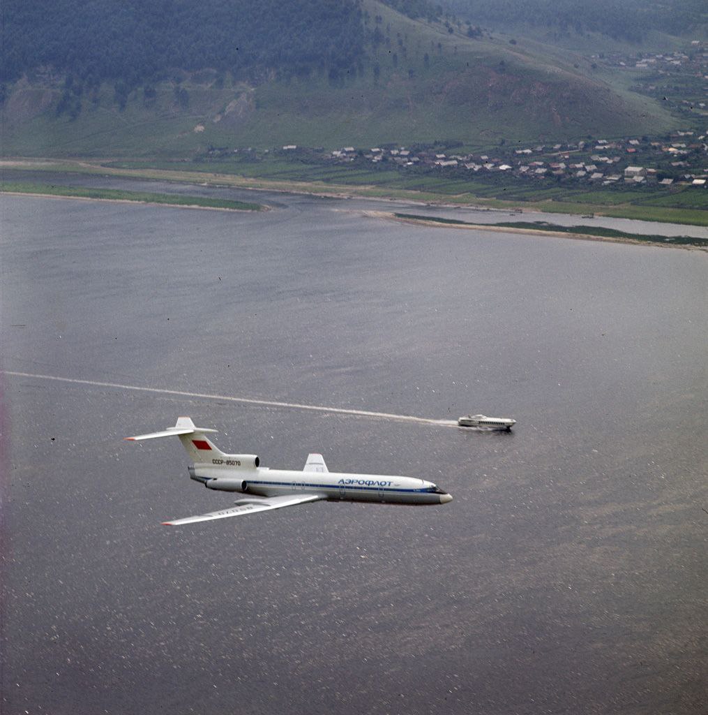 Серийный пассажирский самолет ТУ-154 в полете над Волгой 1974 год