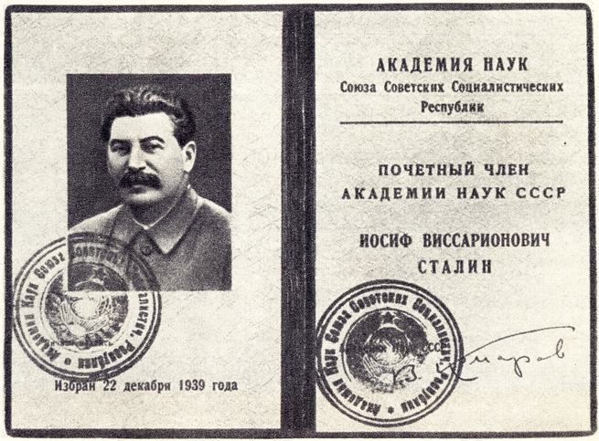 Почётный член Академии наук СССР Иосиф Сталин.