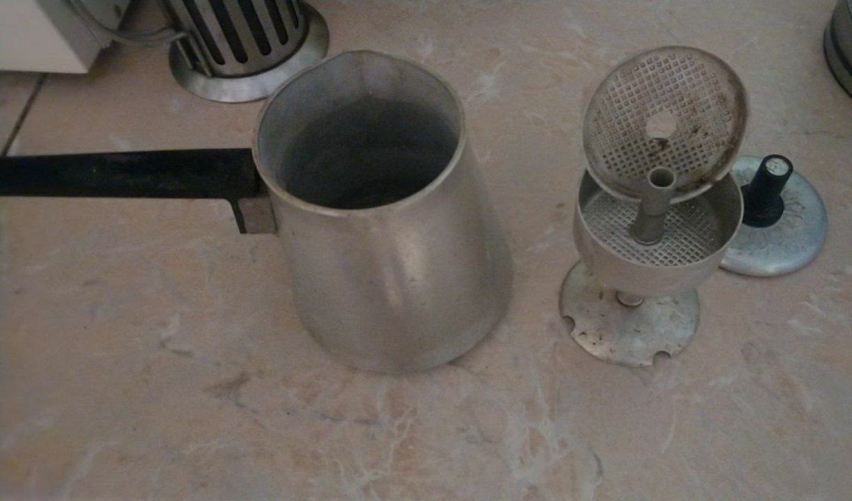 Затем засыпается в верхний контейнер с отверстиями. Турка заливается водой на половину и ставится на огонь. Вода, закипая, поднимается по трубочке и попадает на кофе. Через отверстия стекает в турку. Процесс повторяется.