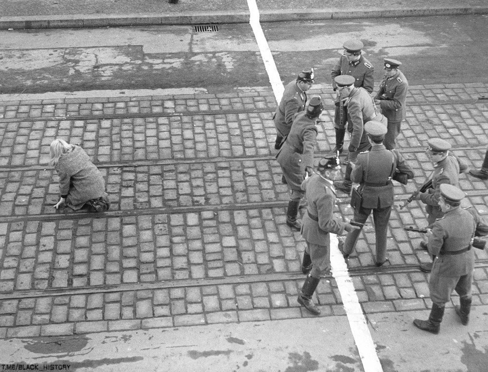Западногерманские полицейские защищают беженку из Восточного Берлина. 1950-е годы.