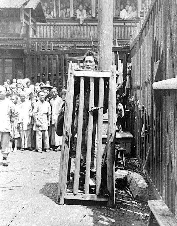 Человек, осужденный за убийство, заключен в деревянную клетку на улице в Китае. Он останется в «тюрьме» до смерти, которая наступит от жажды или голода. Скорее всего, после смерти его тело еще долго будет находиться на обозрении, 1930-е.