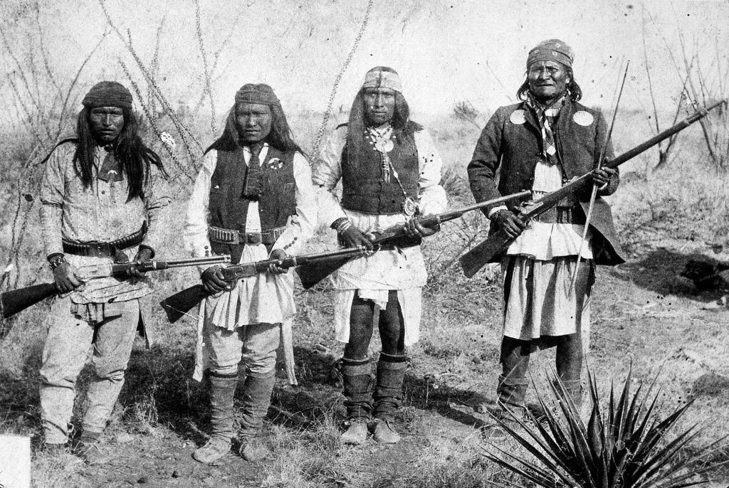 Военный предводитель чирикауа-апачей Джеронимо (справа), который в течение 25 лет возглавлял борьбу против вторжения США на землю своего племени. В 1886 году был вынужден сдаться американской армии.