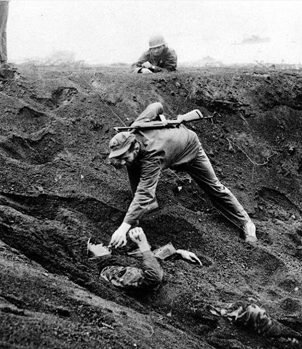 Морской пехотинец США дает сигарету японскому солдату, похороненному в песке. Иводзима, 1945 год.