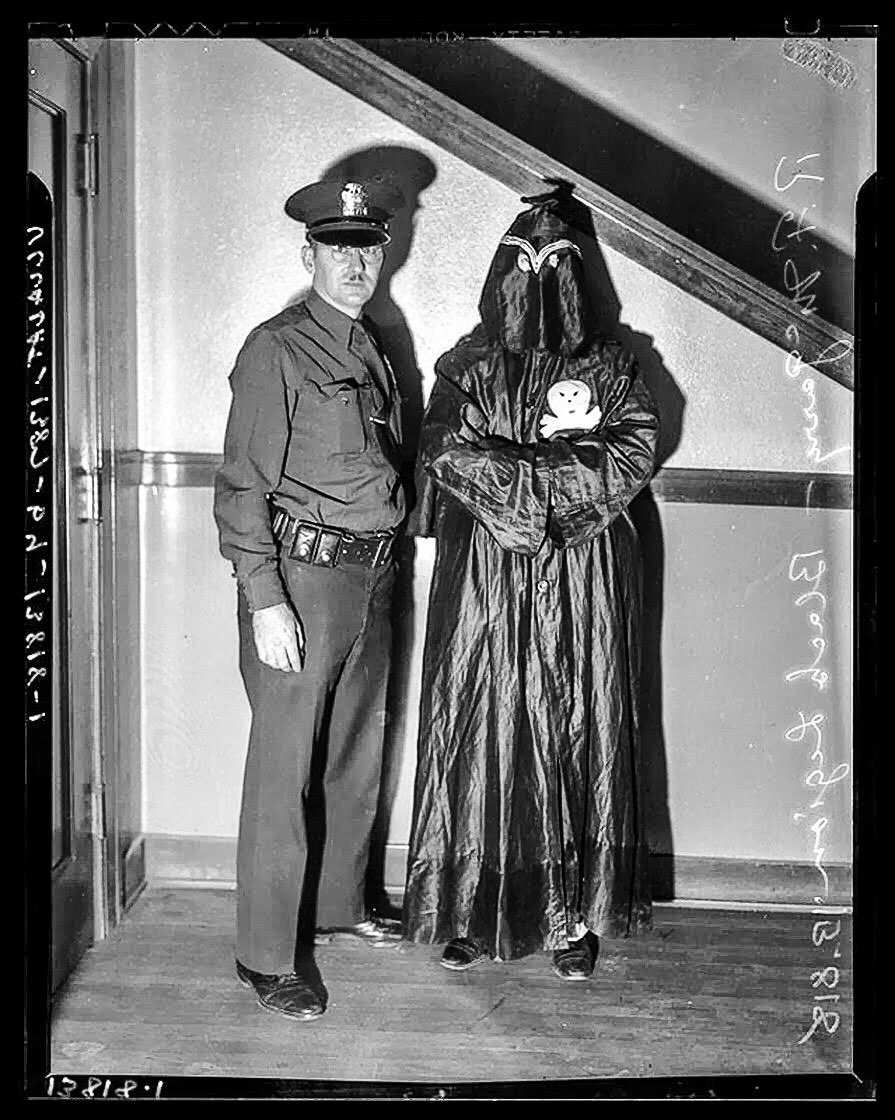 Полицейский стоит рядом с членом «Черного легиона», подпольной организации, отделившейся от Клу-клукс-клана и активно боровшейся с неграми, евреями и католиками, 1936 год.
