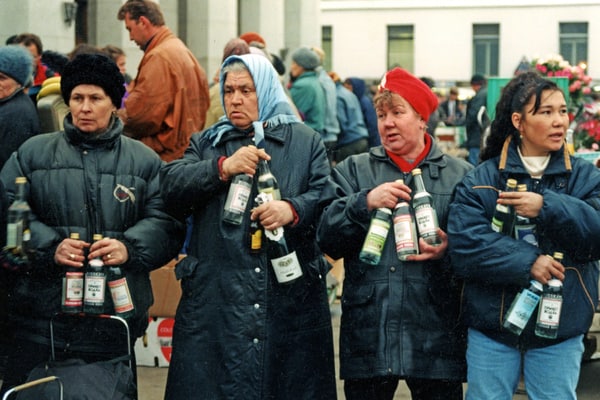 Торговля спиртным с рук у стен Ярославского вокзала. Москва, 1992 год.
