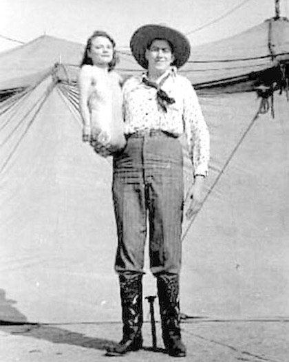 | NULL/12348 В 1949 году Томани, гигант высотой 8 футов с размером обуви 22 дюйма, поселился в Гибсонтоне, штат Флорида. Его жена в два фута, Джинни, известная как "Полу-девочка", усыновили двух дочерей и основали ресторан и парк трейлеров, которые они |