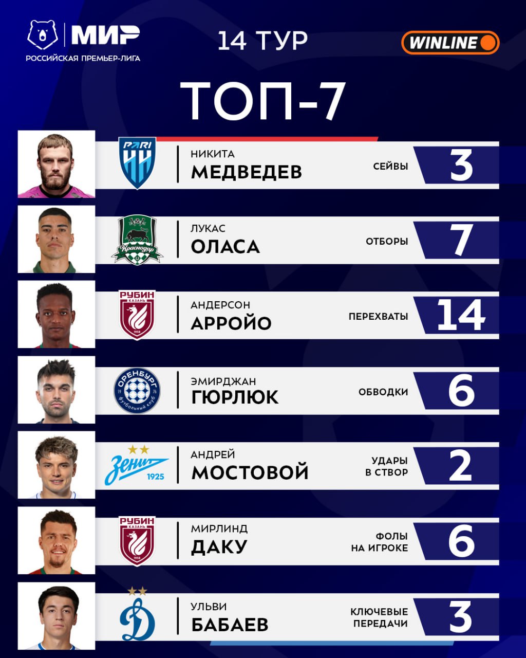 ![]() | https://t.me/premierliga/36563 Никита Медведев делал сейвы, Ульви Бабаев создавал моменты, Мирлинд Даку собирал на себе фолы — презентуем вам статистический топ 14-го тура #МирРПЛ ⚽️ |