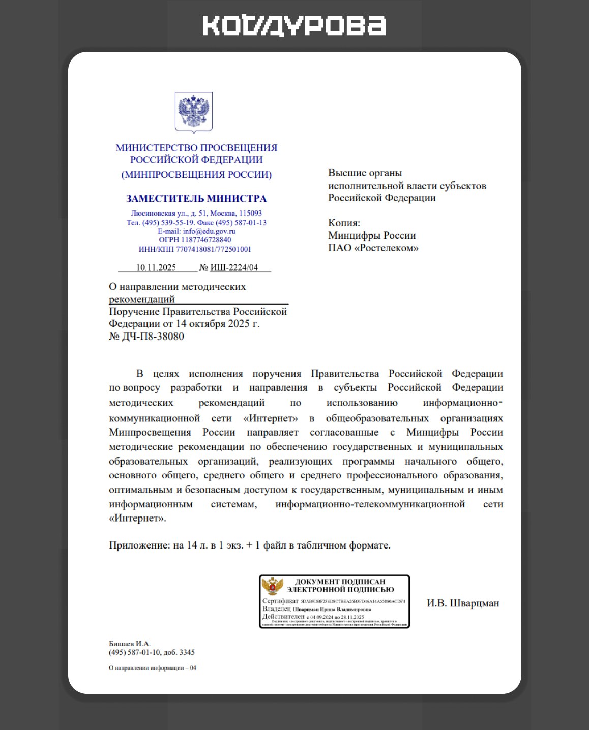 ![]() | https://t.me/d_code/24285 ⚡️** Фейк** Telegram [не включали](https://t.me/mash/69401) в «белый список». Документ, который сейчас распространяется среди популярных Telegram-каналов относится к другой теме — разрешённые ресурсы для образовательных организаций. Данный |