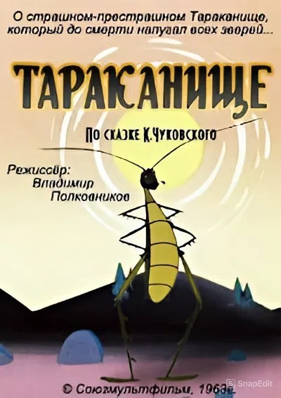 По сказке К. Чуковского о страшном-престрашном Тараканище, который до смерти напугал всех зверей, но был проглочен обыкновенным маленьким воробышком.Производство: СССР / СоюзмультфильмЖанр: мультфильм, детский, короткометражкаРежиссер: Владимир ПолковниковАктеры: Сергей Цейц, Юрий Филимонов, Нина Никитина, Алексей ГрибовСубтитры: отсутствуютПродолжительность: 00:16:30